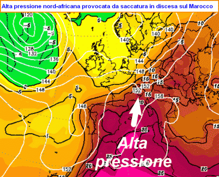 2) Una seconda causa è di tipo prettamente sinottico e trae origine dalle ondulazioni delle onde planetarie delle medie latitudini, le quali viaggiano da ovest verso est contrapponendo cavi d’onda (depressioni) a creste d’onda (anticicloni). Qualora un asse di saccatura affondi dal nord Atlantico verso la penisola Iberica o ancor più fin sul Marocco, ecco subito la controspinta dinamica opposta dall’alta nord-africana, la quale risale a ovest della saccatura per ripristinare l’equilibrio dinamico alterato.