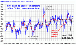 Secondo le rilevazioni e le elaborazioni fornite da Roy Spencer, climatologo della NASA, la temperatura globale del nostro Pianeta è aumentata ad aprile di 0,30°C rispetto alla media calcolata sulla orbice temporale compresa tra il 1981 e il 2010. Il dato segue quello di marzo, che rivelava l’inversione di tendenza (dal novembre 2011 il termometro terrestre era rivolto invece ad una lieve discesa) con il passaggio delle temperature a valori positivi rispetto alla medesima media.
