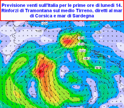 Lunedì 14 la depressione responsabile del guasto temporalesco al nord si sarà già trasferita verso le regioni centro-meridionali. La ventilazione andrà quindi attenuandosi al nord, mentre per il medio e basso mar Tirreno la Tramontana prenderà a soffiare sostenuta.