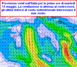nel tratto compreso tra la Tunisia e la Sicilia orientale. Nella notte tra lunedì 14 e martedì 15 ultimi rinforzi di vento settentrionale sono attesi sul mar Jonio.
