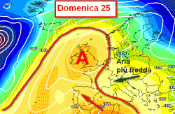 Se la pressione aumenterà in sede inglese, per forza di cose tenderà a deprimersi (in parte) sull’Italia. Ecco quindi il senso della cartina sopra riportata, che mostra appunto un modesto attacco freddo da est per la giornata di domenica.