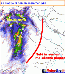 A partire dal pomeriggio la testa del sistema frontale, ancorchè ulteriormente intensificatasi anche per via del sollevamento forzato in blocco da parte dell’arco alpino, si concentrerà su tutto il settentrione, dove darà luogo a fenomeni anche abbondanti, specie lungo la fascia prealpina e pedemontana padana. Piogge anche su Toscana, Umbria, Marche e Lazio. Possibili temporali su Sardegna e Toscana.