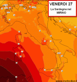 Il rosso minaccioso avanza sulla Sardegna, che sarà la prima regione a cadere sotto le grinfie dell’alta pressione africana.