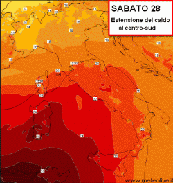 I valori termici nel fine settimana potrebbero localmente superare i 40° sulle Isole e le regioni meridionali. Il nord se la caverà, ma qui sarà l'alto tasso di umidità a rendere difficile la sopportazione del calo, specie in pianura.