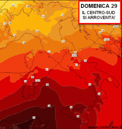 Domenica 29 luglio: game over! L’ondata calda si sarà ormai estesa a tutto il centro e soprattutto al sud, dove i 40° potrebbero essere valicati specie nelle pianure interne e più lontane dal mare.