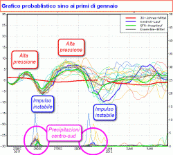 Dall'analisi delle mappe probabilistiche si evince una altalena di eventi tali da far pensare ad una maggior probabilità di precipitazioni al centro e al sud. Saliscendi dei termometri almeno sino dopo Capodanno.