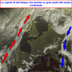 Quando si dice "cupola anticiclonica con tempo stabile e soleggiato". L’immagine satellitare di questa mattina, che vi consigliamo di ingrandire, disegna alla perfezione i contorni dell’immensa figura stabilizzante che sta interessando quasi tutto il nostro Continente.