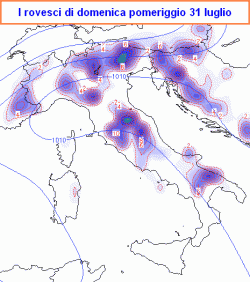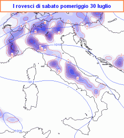 Abbiamo voluto mostrarvi cosa prevede il nostro modello per il pomeriggio di sabato e per quello di domenica. Si noterà come gli acquazzoni finiscano, oltre alle zone montane, tendano ancora a coinvolgere, seppur localmente, anche quelle pianeggianti.