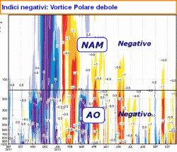 Lo possiamo fare grazie a due sigle, appunto il NAM, acronimo di North Annular Mode e l’AO, che sta per Oscillazione Artica. Entrambi ci indicano lo stato di salute del vortice polare su tutte le quote, ovvero quella trottola di aria gelida che ruota in senso antiorario attorno al Circolo Polare Artico racchiudendo dentro di sè tutto il gelo a disposizione del prossimo inverno.
