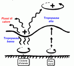 Se l’indice NAO si porta in terreno positivo, ossia se il ciclone semipermante d’Islanda si approfondisce (e le alte pressioni subtropicali si portano verso il Mediterraneo), sulla verticale dell’Isola si ha un abbassamento della tropopausa (limite tra troposfera e stratosfera) accompagnata da una anomalia positiva della vorticità potenziale. Con questo stato di cose la propagazione in spessore delle onde anticicloniche che si trovano a transitare in Atlantico incontra l’anomalia e tende così a riflettere il flussi di calore associati verso l’equatore, escludendo la traiettoria polare che invece provocherebbe un indebolimento del relativo vortice stratosferico.