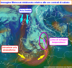 Questa la situazione principale, ma per capire il perchè dell’evento genovese dobbiamo analizzare anche il dettaglio. Partendo dalle quote superiori abbiamo individuato un consistente abbassamento della tropopausa in corrispondenza di una intrusione di aria molto fredda e secca di origine stratosferica in corrispondenza della curvatura della Corrente a Getto. La traccia di questa massa d’aria la possiamo vedere nell’immagine satellitare allegata, dove è rappresentata da quella scia color arancio.