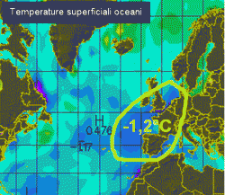Le depressioni collegate alla circolazione ciclonica circumpolare sprofondano decise sull’Atlantico poi frenano e vanno a finire in un buco invisibile in corrispondenza della Penisola Iberica. Cosa mai attirerà verso quel buco le perturbazioni, anche quelle destinate a noi? La risposta sta nella disposizione delle temperature superficiali dell’oceano.