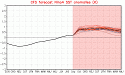 Abbiamo constatato anzitutto che il Niño, ovvero l’anomalo riscaldamento delle acque superficiali dell’oceano Pacifico tropicale, ha tentato varie volte di rimettersi in moto, ma con scarso successo. Al suo posto si conferma una fase neutra prevista quasi all’unanimità dai modelli, con scarti delle temperature oceaniche non superiori a 0,5-0,8°C (nel grafico qui a fianco le previsioni probabilistche riferite al settore occidentale del Pacifico). Le influenze sul tempo di casa nostra, evidenti solitamente dopo 3-4 mesi in caso di forti anomalie, risulteranno pertanto limitate, se non addirittura assenti.