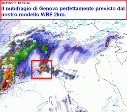 Davvero confortante l’attendibilità del nostro modello ad area limitatissima WRF 2km che ha subito proprio in queste ultime settimane alcune importanti migliorie: il nubifragio genovese, originato da un cattivo temporale rigenerante, è stato colto perfettamente.