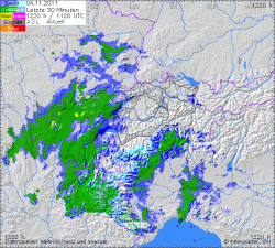 Il radar mostra esattamente la traccia del temporale autorigenerante in azione su Genova e in sfondamento a ventaglio anche in Valpadana, dove ha prodotto fenomeni moderati.