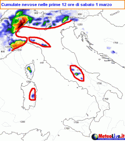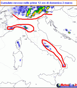 Arriviamo così a sabato, quando la perturbazione rallenterà per approfondimento di un minimo di pressione sul nostro centro-nord. La giornata vedrà l’asse delle nevicate spostarsi su alto Piemonte, su stutto il settorie alpino centro-orientale e sull’Appennino Emiliano. Le quote rimarranno pressochè invariate rispetto a venerdì. La novità è che verrà preso anche tutto l’Appennino, con interessamento anche del Preappennino e delle zone interne in genere. Al centro quote neve fino a 700-1000 metri, al sud tra 900 e 1200 metri.