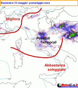Tanto per iniziare i fenomeni temporaleschi nel corso di domenica pomeriggio, e anche in serata, si propagheranno al centro, ma potrebbero lascar da parte la Toscana, posta a sfavore rispetto alle correnti portanti. I fenomeni più consistenti si dovrebbero invece avere su Marche, Umbria e Lazio.