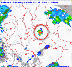 Interessante notare che, dopo la rinfrescata portata dai rovesci, i quali hanno fatto crollare la temperatura nei pressi del centro (Piazzale Cadorna) da 30 a 22°C (a Linate, periferia est, solo da 29 a 27°C), il mancato ricambio d’aria (niente perturbazioni) ha riportato a breve giro di posta sulla città la sua consueta cappa di afa (in centro alle 19.00 si era tornati da 22 a 26°C), anche aggravata nei quartieri periferici, interessati da precipitazioni deboli. Come dire: tutto quel parapiglia per nulla.