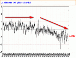 Il trend impostato sembra inoltre orientato ad un ulteriore crescita con rientro nella media dopo quasi sei mesi di sofferenza. Sofferenza che invece continua ad attanagliare l’Artico. L’ammanco glaciale della banchisa in questo caso permane stabile con un’estensione che gioca sul filo del milione di chilometri quadrati al di sotto della media trentennale.