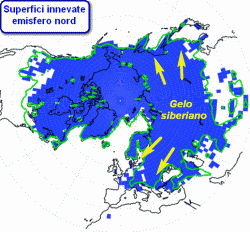 Il colpo d’occhio è semplicemente impressionante e lascia ben poche parole da aggiungere. Spagna, parte del Regno Unito, il nostro estremo sud e la Grecia meridionale sono le uniche parti del suolo europeo al momento sgombre dalla copertura nevosa. Guardate la massa di ghiaccio che ricopre il Continente euro-asiatico e pensate che arriva proprio dal cuore di quello sconfinato serbatoio di gelo l’aria che respiriamo in questi giorni.