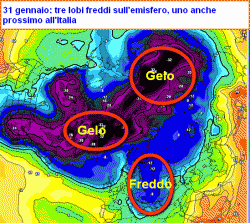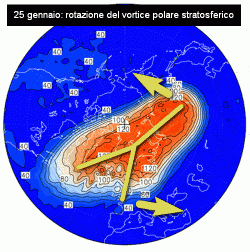 L'analisi delle dinamiche stratosferiche, mostra una lenta affermazione dell'anticiclone aleutinico e una concomitante rotazione dell'asse del vortice polare, che si disporrà con un ramo secondario verso l'Europa centrale. Ciò depone per una fase climatica più fredda su tutta l'Italia nell'ultima settimana di gennaio, anche se non si prevedono particolari eccessi.