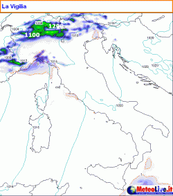 VIGILIA: la perturbazione si avvicina dalla Francia e inizia a richiamare venti miti e temperati da Libeccio sul nostro settentrione. Scattano le prime precipitazioni, soprattutto su Alpi, Liguria e Lombardia centrale. Neve intorno a 1100-1300 metri sulle Alpi, 1600 metri sull’Appennino settentrionale.