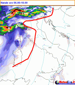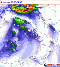 NATALE: sopraggiunge al nord la massa nuvolosa legata alla perturbazione che darà luogo ad una giornata di generale maltempo. Le precipitazioni più abbondanti attese su Liguria, fascia alpina, prealpina, pedemontana e, dal pomeriggio, anche sul nord della Toscana e sulla Sardegna.