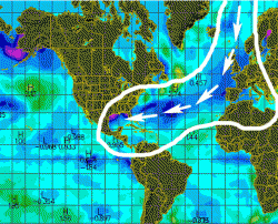 La traccia sembra seguire il percorso di ritorno (freddo) della Correne Nord-atlantica (ramo della Corrente del Golfo) e tradisce pertanto un intenso scorrimento di acque fredde in uscita dalle latitudini artiche verso le medie latitudini. Quali sono le forzanti che agiscono dagli oceani verso l’atmosfera? La più importante implica uno sbalzo della pressione atmosferica tale che, al di sopra di acque fredde, la Corerente a Getto tende a ruotare in senso antiorario (ciclonico).