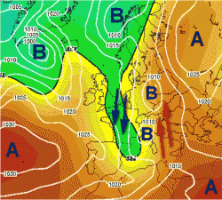 Un’alticiclone di blocco si distendeva sui Balcani chiudendo di fatto la porta al fluire delle correnti occidentali. Sulla Francia si andò scavando un profondo minimo depressionario che coinvolse entro le sue spire vorticose anche la penisola Iberica, le isole Britaniche ma, soprattutto l’Italia, posta sul settore più attivo della depressione stessa. Un intenso flusso di correnti sciroccali nei bassi strati precedette l’arrivo del corpo nuvoloso principale il quale andò ad imperniarsi sul golfo Ligure frenando drasticamente la sua corsa.