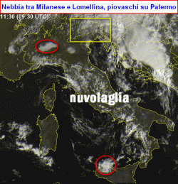 Interessante anche la catena di nubi a sud-ovest della Sardegna, che potrebbero dar luogo in mare aperto anche a dei rovesci. Da notare l’ostinazione con cui la nebbia ha interessato per diverse ore Pavese, Lomellina e Milanese, mantenendo la temperatura sino a mezzogiorno sotto i 20°C e il cielo spesso nuvoloso in virtù del suo graduale sollevamento.