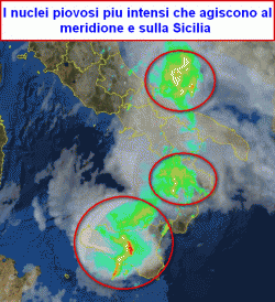 I nuclei piovosi più importanti sono tre: sulla Sicilia, sulla Calabria e in prossimità della Puglia Garganica. Quest’ultimo ha scaricato 103mm dalla mezzanotte sulla città di Foggia, con inevitabili conseguenze.