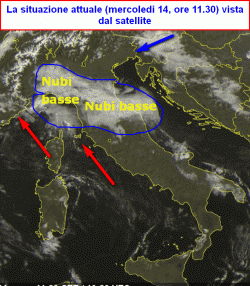 Sul Mediterraneo centro-occidentale sono ancora attive correnti molto umide da sud-est (frecce rosse); sull’alto Adriatico si sta invece impostando una circolazione più secca da nord-est (frecce blu). Nella zona di conflitto tra queste due diverse correnti abbiamo la formazione di tappeti nuvolosi in genere stratiformi che rendono il cielo di un colore poco edificante.