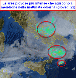 Colpita la Calabria, il nord della Puglia, il Molise e la parte settentrionale della Lucania. Altri nuclei piovosi stanno nascendo sullo Ionio, ma non dovrebbero interessare la terraferma.