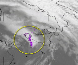 Ecco il grappolo di temporali che questa mattina sta spazzando da ovest verso est la Sicilia. Si notano molto bene le fulminazioni che si dipartono in una linea verticale al centro di un grosso ammasso nuvoloso.