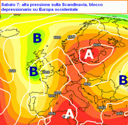 Situazione sabato 7 settembre: (+120h): l’alta pressione rilascia un massimo sulla regione scandinava, i flussi portanti si sviluppano lungo i meridiani per un blocco depressionario sull’est europeo. Una seconda saccatura protende il suo asse dal nord dell’Atlantico fin sul Marocco. Sull’Italia si dispongono correnti meridionali che, al centro-nord, avranno curvatura ciclonica. Sono attese manifestazioni temporalesche soprattutto al nord-ovest. Caldo a sud.