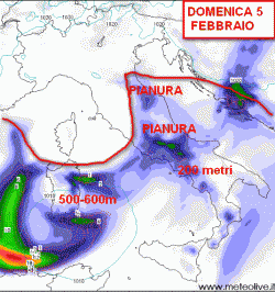 La cartina che vedete poco sopra è la previsione per la giornata di domenica 5 febbraio. Ben si notano le precipitazioni che agiranno su parte del centro ed al sud, oltrechè sulla Sardegna.