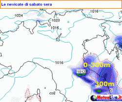 Mattina: il minimo di pressione sull’alto Tirreno si sposta levante e raggiunge il medio Adriatico. I venti ruotano a nord-ovest e portano ancora nevicate sparse generalmente deboli in Valle d’Aosta, lungo i crinali alpini di confine e sul Friuli Venezia Giulia sino a 300-400 metri. Rasserena invece su val Padana, versanti sud-alpini e in Liguria, pur in un contesto decisamente freddo.