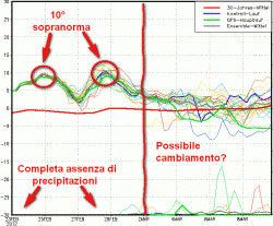 Quando cambierà la situazione? Il grafico sopra riportato da qualche speranza di cambiamento entro i primi giorni di marzo. Perlomeno si tornerebbe in media termicamente e potrebbe comparire qualche timida precipitazione.