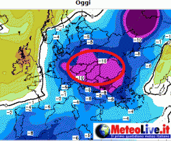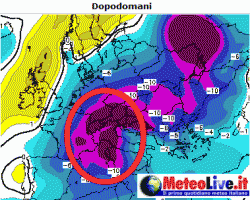 Tale anomalia, rappresentata sulle nostre due mappe, mette in evidenza la traiettoria del nocciolo freddo a partire da oggi, giovedì 9 febbraio, fino a sabato 11, quando raggiungerà il culmine della sua azione perturbatrice sull’Italia.