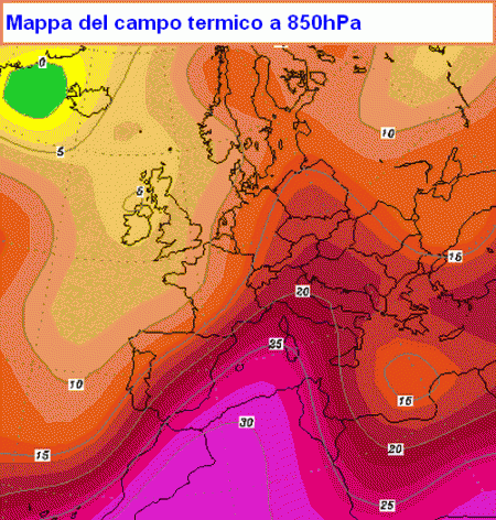 L’impressionante ondata di calore che stava per interessare l’Italia il 22 luglio del 2003. Si noti l’andamento della temperatura alla quota isobarica di 850hPa, con il valore di 25 gradi pronto a invadere il Tirreno e la Isole Maggiori. Fonte archivio Wetterzentrale.