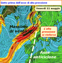 Come possiamo notare dalla prima mappa NCEP (in alto), riferita a venerdì 11 maggio, lo strappo di vento si troverà a monte dell’asse anticiclonico. Questo significa che l’alta pressione verrà da esso rinforzata per motivi dinamici, ovvero dal vento che sprofonderà dalle alte quote avvitandosi verso il basso andando a seccare e a riscaldare la massa d’aria.