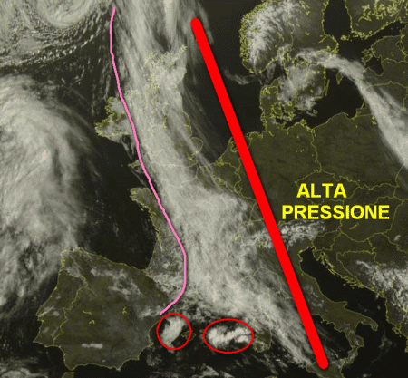 …e pensare che tra ieri e la scorsa notte la medesima perturbazione ha dato luogo a piogge anche consistenti su alcuni settori della Spagna e della Francia; anche adesso riesce a produrre qualche temporale ad ovest della Sardegna e sulle Baleari (cerchi rossi), ma il limite invalicabile è posto oltre la linea rossa; oltre quel limite non ci sarà storia e il fronte perturbato dovrà chinare la testa davanti a "sua maestà" l’alta pressione.