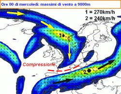Solitamente la Corrente a Getto Polare soffia a grandi velocità quando la grande trottola del vortice polare, del quale costituisce la naturale cintura di vento, mostra parimenti valori di pressione molto profondi. In questo periodo invece il vortice polare è molto disturbato e debole, ma il Getto soffia via veloce con punte fino a 150 nodi a 9000 metri di quota (vedi in figura).