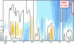 Ora, partendo dai piani alti, dobbiamo confermare un dato che era già stato rilevato e di cui vi abbiamo già dato notizia a suo tempo: la stratosfera polare ha smesso di raffreddarsi, l’indice che lo rivela, il NAM, è sceso sotto la soglia di carico. Il motivo? Un’onda anticiclonica è andata a infrangersi con il suo spessore verticale contro la tropopausa generando un flusso di calore convergente verso il vortice polare stratosferico che ha subito uno scossone di tutto rispetto.