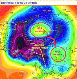 Ciononostante la manova suddetta sarà sufficiente a creare un certo scompiglio in un vortice polare troposferico (quello del piano di sotto!) forse abituato troppo bene finora. Esso verrà indebolito da una fiondata anticiclonica dovuta proprio alla trasmissioni di quel calore cui accennavamo poc’anzi e amplificatosi per attrito verso il basso. La bolla dinamica partirà dai cieli dello Stretto di Bering (mappa di sabato 21) ma pare possa ricevere man forte dall’alta pressione russo-siberiana in via di termicizzazione.