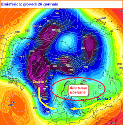 I due ciclopi pare andranno incontro ad una mutua amplificazione, dopodichè la rotazione oraria di tutto il blocco superstite del vortice polare sarà costretto dilagare verso le medie latitudini. La destinazione finale è rappresentata dalla mappa riferita a giovedì 26 gennaio, con un doppio ingresso, uno dalla via artica marittima del Labrador e l’altra da quella continentale europea. L’impianto teorico sarebbe quello favorevole a condizioni di tempo senz’altro invernale sull’Italia, ciononostante dobbiamo considerare una discriminante ancora in fase di studio da parte nostra.