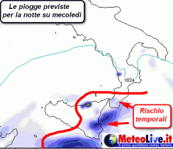 Tra martedì e mercoledì saranno sotto mira soprattutto la Sicilia e la Calabria. Data la particolare disposizione delle correnti ci si devono aspettare anche alcuni spunti temporaleschi, che si verificheranno segnatamente su Messinese, Catanese, Ragusano e Siracusano per la Sicilia, Reggino e Catanzarese per la Calabria.