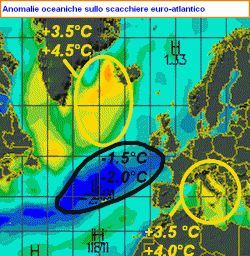 Ecco che alte e basse pressioni tendono a sovrapporsi rispettivamente alle anomalie positive e negative. Vogliamo un esempio? Eccolo. Guardate la figura in alto: essa rappresenta la mappa delle anomalie superficiali dell’Atlantico de del Mediterraneo. Si nota un evidentissimo tripolo, con il Mediterraneo centrale che sfoggia valori anche fino a 4°C sopra la media stagionale, così anche come il settore atlantico prossimo alla Groenlandia (ma qui una volta il mare era ricoperto dai ghiacci).