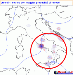 Per la pioggia? La perturbazione prevista transitare dal centro-nord verso il sud incontrerà notevoli difficoltà nella sua progressione e pertanto lunedì rimarrà un tessuto nuvoloso irregolare di tipo prefrontale cui si immergerà qualche isolato temporale. I fenomeni, limitati appunto a qualche rovescio, saranno più probabili nelle zone interne e montuose, con particolare riferimento a Molise, Campania, Potentino, Sila e nord Sicilia.