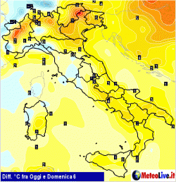 Nord-est ed Emilia Romagna: valori fino a 10-12°C al di sopra delle medie sulla fascia montana, intorno a 6-8°C sul Triestino. Anche in questo caso scarti più contenuti sulle aree padane per nebbie e inversioni termiche che potranno anche sconfinare sul mare.